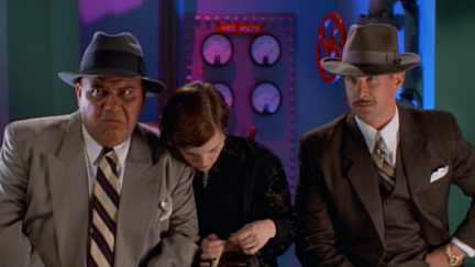 J Edgar Jr (The kids called him Jedjr!) falls in love with the frozen Bonnie, for reasons. And decides to whip up one of those cure-for-death tonics that would, like in the corresponding Lois & Clark episode, foundationally change the lives of every man, woman and child on Earth, but is instead used as a throwaway to set up a story about a trio of bank robbers running around for a while. There’s a weird little aside where J Edgar Jr suggests that the public explanations for what happened to Parker, Dillinger, and Capone were just cover stories, which I guess is supposed to suggest that Parker wasn’t shot 26 times in what can only be described as a turkey shoot and Capone didn’t die as an enfeebled stroke debilitated syphilitic madman. And that, in turn wouldn’t require the make-up department to affix Bonnie actress (and Saved by the Bell alum) Kiersten Warren with scars from the multiple gunshots wounds her character took to the face and allowed Polito to physically intimidating while also speaking in complete sentences and being aware of what he was and what he was doing at any given moment. And Dillinger’s death was covered up because, I dunno, I guess they didn’t want him to feel left out of the fun or something.